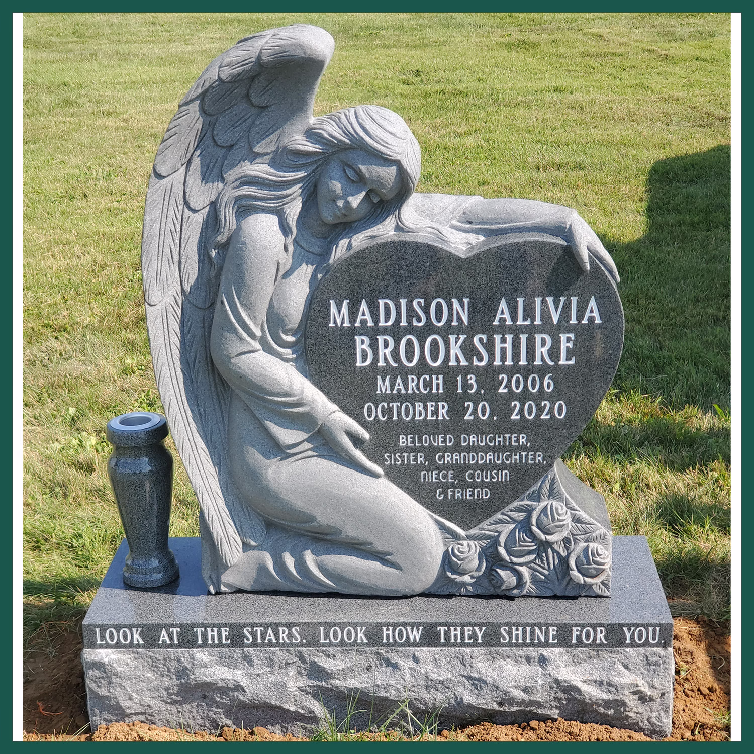 • Last – Creation: After you have approved the perfect design with the best materials, we get to work crafting your custom piece. Once finished, we deliver the final product wherever you need. We even handle installation at the cemetery.